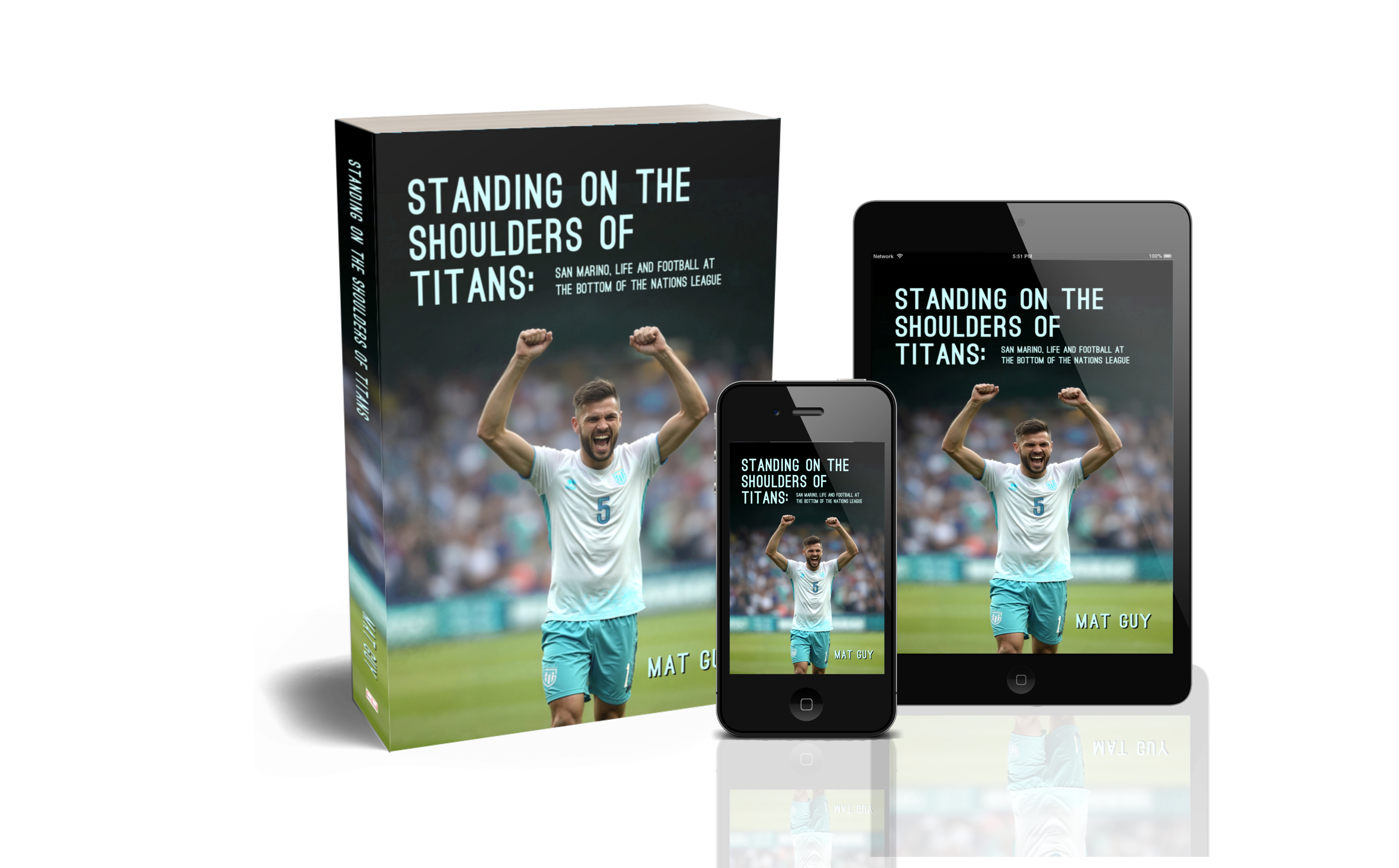 Behind the right-hand goal more equipment for converting one sport into another lays in wait. While behind the other end a sea of trees rise like a rich, lush, natural Kop, Curva Sud, Gallowgate End. Over its shoulder, the capital, Monte Titano looming in the haze. Indistinct. Like a dream.