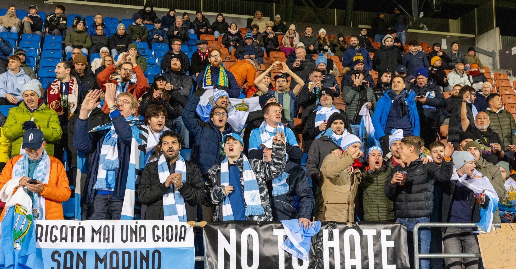 At the other end of the main stand, the Brigata Mai Una Gioia clap their heroes out onto the pitch too. Stood among their blue and white San Marino flags and banners draped across empty seats, tied to railings, this small group of 15, 20 stand with hope rather than expectation filling their hearts. After all, even in this lowly Nations League, League D clash in front of a little under 600 supporters, Malta are still 35 places higher in the FIFA rankings.