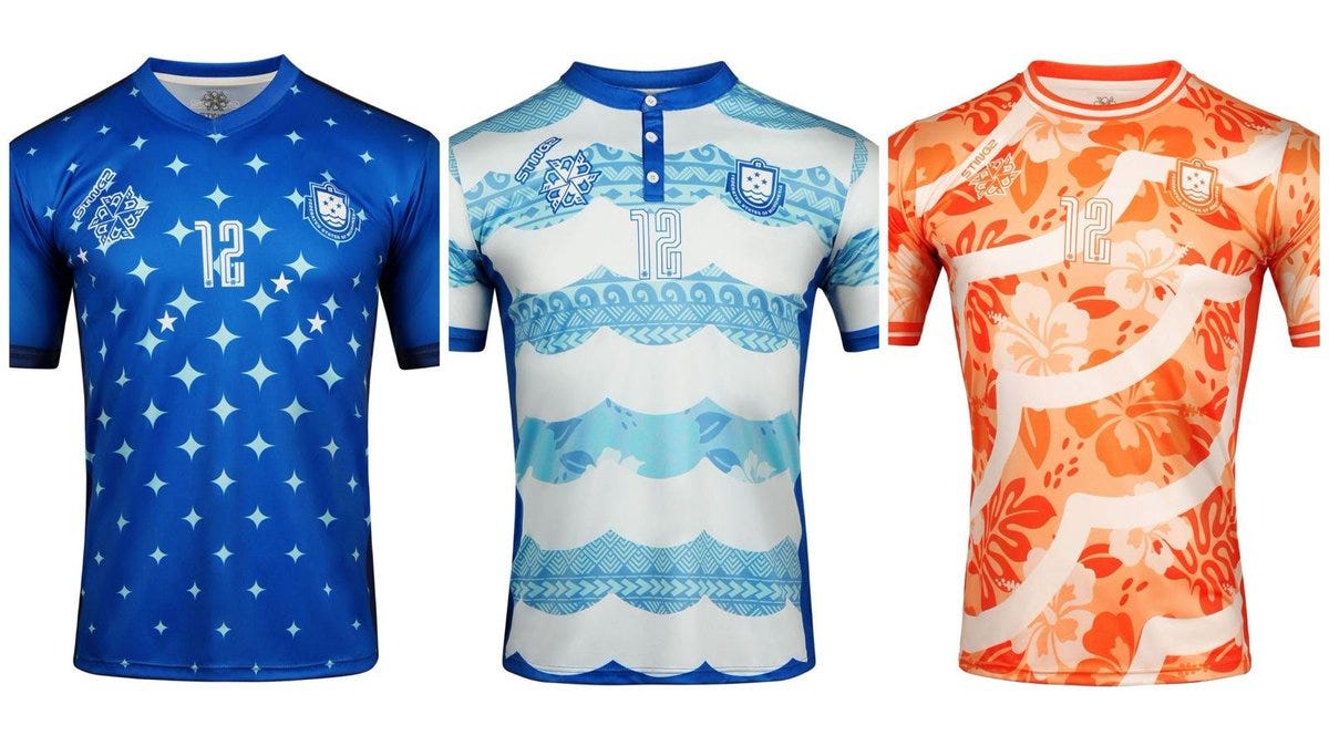 The official replica home jersey of the Federated States of Micronesia stands out with its white and pacific blue hoops arranged in a flowing wave design, complemented by a crisp navy henley collar and sleeves. Its negative-space approach brings subtle depth to the shirt, with Micronesia-inspired tribal patterns watermarked into alternating hoops, creating a distinctive look that blends modern style with cultural heritage. The alternative kits aren’t too shabby either. Brilliant work by Stingz.