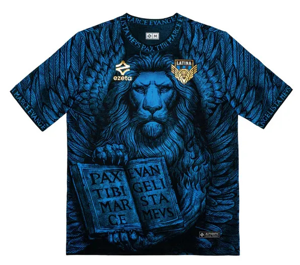In truth, I could have picked any shirt produced by the Italian brand Ezeta with their mix of colour and visual experimentation that is always rooted in each club’s wider culture. This one pays tribute to the flag of Saint Mark, a symbol of unity among the peoples who founded the city of Littoria, now Latina where the traditional stripes give way to the Winged Lion that dominates the entire kit. The collar and sleeve trims are decorated with the historic inscription “Pax Tibi Marce, Evangelista Meus,” a solemn homage to the city’s patron saint.