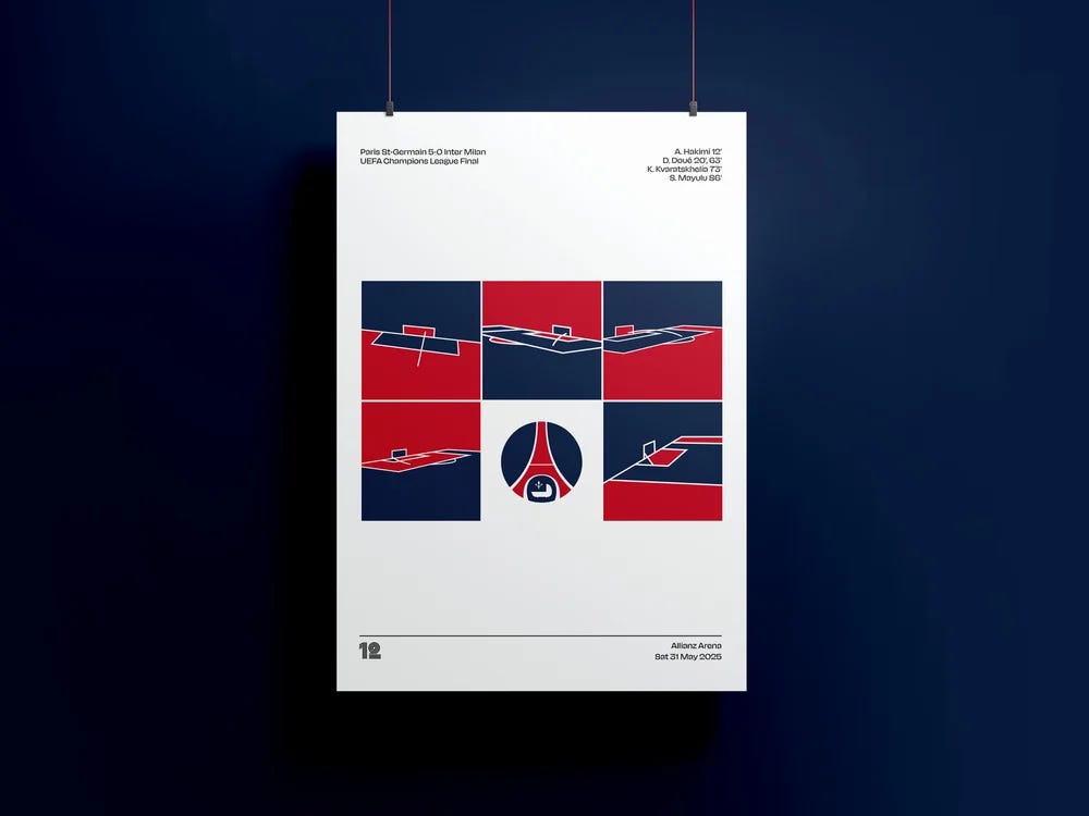 From 12 Yards is run by a team of creatives who illustrate the beautiful game — turning epic moments, matchday memories and iconic gear into stylish prints, shirts and pins. Their work taps into football’s soul: the boots that defined whole generations, legendary goals, stadiums and club histories all recast as art. With apologies to my Inter supporting friends and subscribers, this poster from the Champions League final looks really cool and unlike anything I’ve seen before.