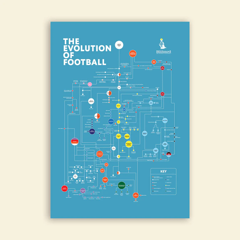This art print offers a full-blown timeline of football’s evolution from its early “kick and rush” roots to today’s modern tactical era. Quietly elegant and richly detailed, it makes for a perfect wall-piece for anyone who loves the history and shifting styles of the game.