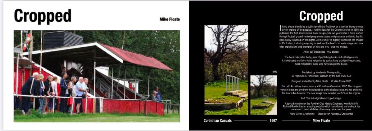 A hardback book of 114 pages, Cropped features 80 football grounds, many photographed decades ago which in some cases are long unchanged, rebuilt, or even lost to time. It uses a unique cropping method to bring out surprising new perspectives from old images, showing grounds from outside views to stands, full-ground views, and even grounds as they sit in the landscape. Blending nostalgia with careful archival photography, it offers readers a visual journey through the history and atmosphere of football grounds as captured over many years.
